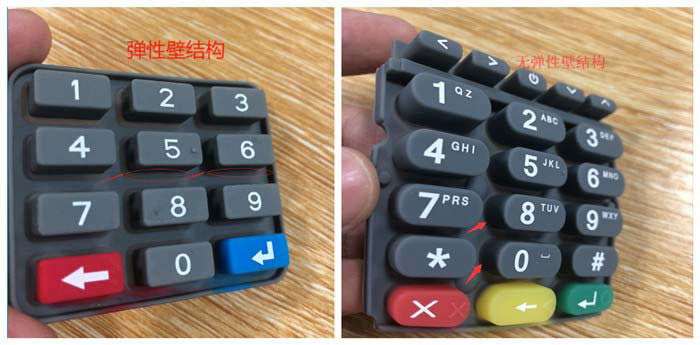 大多數硅膠按鍵都是選擇用碳?;蚴菍щ娪湍珌韺崿F導電功能,而直接通過按鍵來導電則要求按鍵具有按下去彈回來的彈性壁結構。(鍋仔片和輕觸開關他們自帶回彈功能,所以對應的硅膠按鍵一般不需要再設計彈性壁結構)