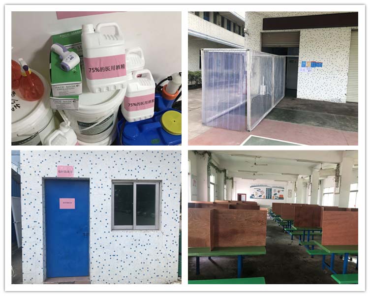 其次我們完善了廠區防疫設施設備,加強了廠區衛生安全。公司配備了臨時隔離室和隔離留觀室,在進入生產硅膠制品的車間入口設立了安全通道,紅外測溫被配備了口罩手套。飯堂進行了改造,每個位置采用了隔板確保兩人相隔一米。廠區包括員工宿舍都噴灑了84消毒液進行消毒處理,飯堂重新用水沖洗干凈,垃圾桶則暫時遷移到廠門外。