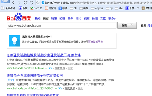 2、用百度搜索這家硅膠制品廠在百度上的收錄情況,如site:www.zxuewang.com 這樣你查到就是東莞市博皓電子科技有限公司在百度的收錄情況,360、搜搜等搜索引擎也是一樣的方法。