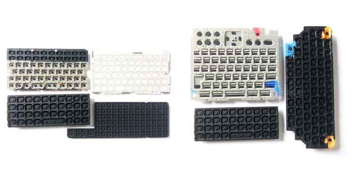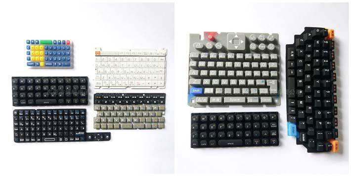 從上圖可以看到迷你鍵盤的長度可以從幾厘米到幾十厘米不等,可以是純硅膠按鍵也可以是P+R的,鍵盤上的key可以做成不同顏色,按鍵字符既有絲印也有鐳雕樣式的。它們用于學(xué)習(xí)機(jī)、標(biāo)簽打印機(jī)、工業(yè)儀表等產(chǎn)品上,不但外觀精美手感柔和,并且非常耐用,可以達(dá)到20萬次以上的使用壽命。迷你硅膠鍵盤的背面導(dǎo)電有采用導(dǎo)電油墨、導(dǎo)電黑粒和鍋仔片。