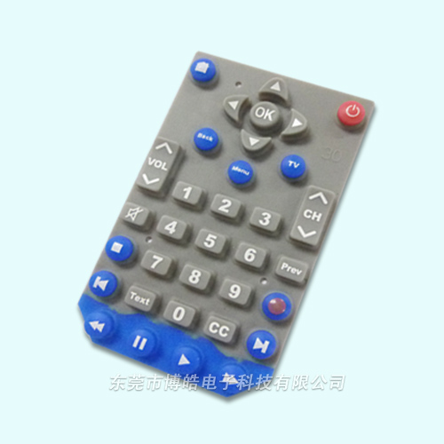 - 產品簡介:該產品適用于電視遙控器,采用深灰色硅膠原材料,再加搭配藍色使遙控器看起來更加多姿多彩,紅色按鍵是開關電源鍵,在遙控器底部附有導電油墨,可起到導電效果。